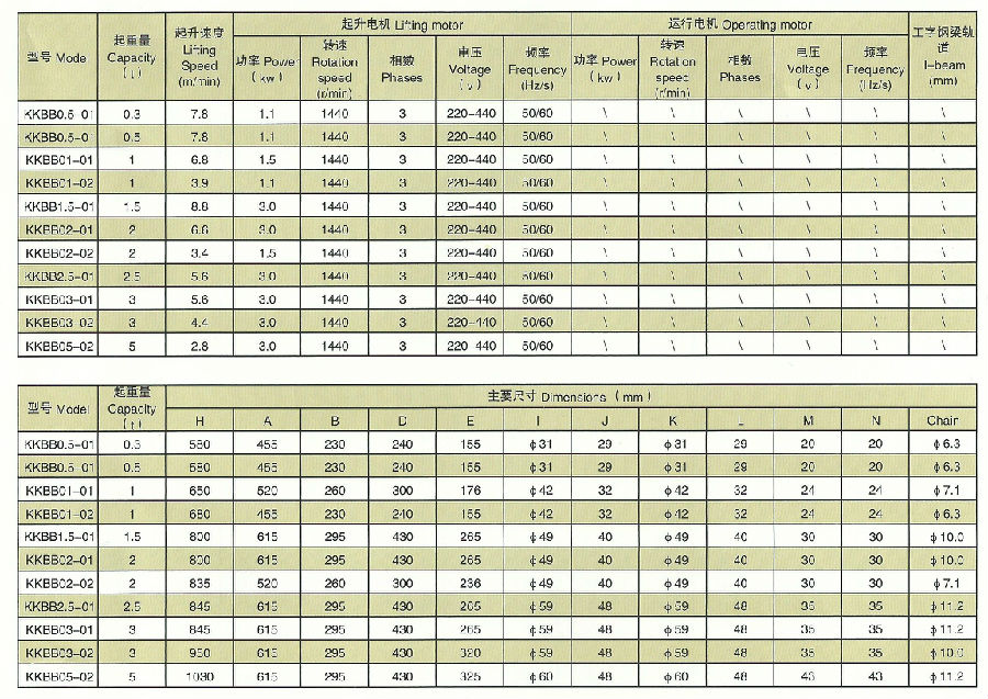川崎KKBB環(huán)鏈電動葫蘆參數(shù):