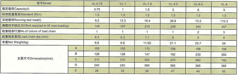 VL手扳葫蘆參數: